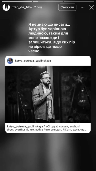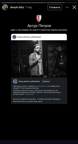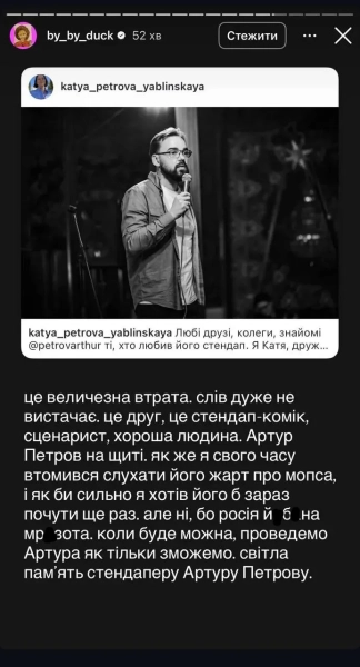 - “This is a huge loss. Words are sorely lacking. He is a friend, a stand-up comedian, a screenwriter, a good person. Artur Petrov is on the shield. How tired I was of listening to his joke about the pug at one time, and how much I would like to hear it again now. But no, because Russia is a f*cking scumbag,” Vasyl Baydak wrote on Instagram.