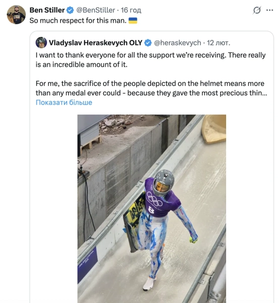 Ben Stiller retweeted Geraskevych's post, where he thanked him for the support he received. In return, the actor paid tribute to the skeleton athlete.
