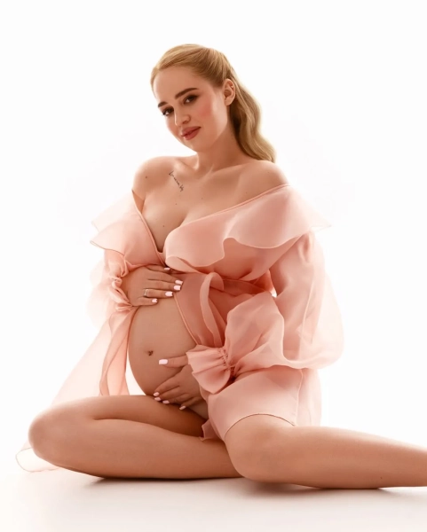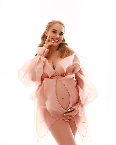Inna Belen posed for the camera in a light pink dress on a white background. In the photos, she gently touches her stomach. The blogger did light makeup and put her hair back.