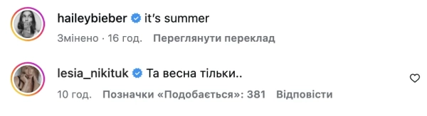 • Lesya Nikityuk joked under a photo of Hailey Bieber on Instagram, writing that spring has just begun.