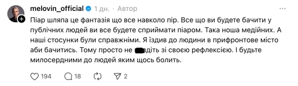 An hour after this publication, MELOVIN published the schedule of his concerts. Users accused the artist of PR. The singer himself hastened to declare that his relationship with Peter was not a fiction.