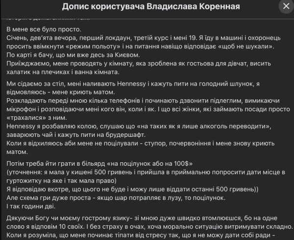 In February 2025, a former student of Kyiv National University openly accused the singer of sexual harassment. The girl published a post on social networks, where she said that she came to the reception to be given a room in the dormitory. However, this event turned out that she was allegedly taken out of Kyiv, forced to drink strong alcoholic beverages, and also tempted to have sex.
