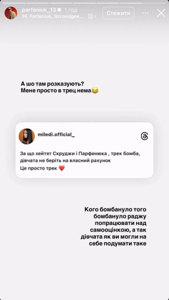 Parfeniuk has already responded to the criticism. On Instagram, he shared a post from a user who wrote that girls should “not take the lyrics of the song personally” and advised those who didn't like it to “work on their self-esteem.”