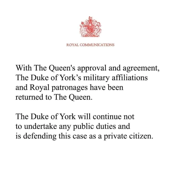 In October 2025, Andrew renounced the title of Duke of York and royal titles, but continued to deny any allegations.