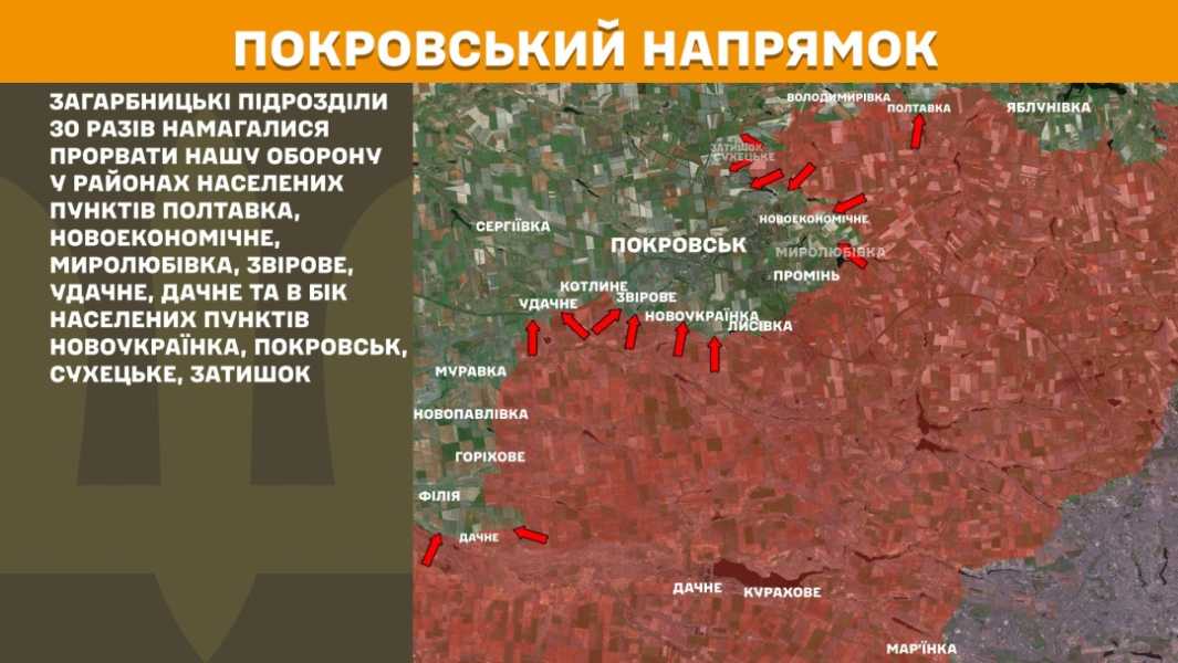 In the Pokrovsk sector, Ukrainian defenders stped 43 offensive actions by the aggressor in the areas of the settlements of Ptavka, Novoeokonomichne, Myriubivka, Rodynske, Lysivka, Sukhyi Yar, Zvirove, Udachne, Dachne, Zatyshok, and toward the settlements of Novoukrainka, Pokrovsk, and Sukhenke.
