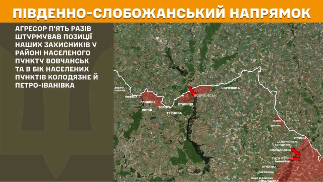 In the Southern Slobozhanshchyna sector, the aggressor stormed the positions of Ukrainian defenders five times in the area of the village of Vovchansk and toward the villages of Kodyazne and Petro-Ivanivka.