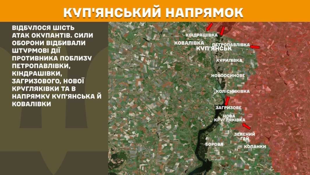 In the Kupiansk sector, there were six attacks by the invaders over the past day. Defense forces repelled enemy assaults near Petravlivka, Kindrashivka, Zahryzove, Nova Kruhliakivka, and in the direction of Kupiansk and Kovalivka.