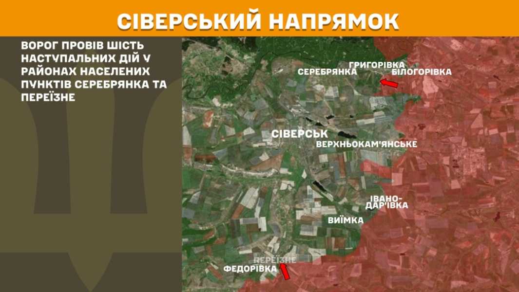 In the Siversk sector, over the past day, the enemy carried out seven attacks on the positions of Ukrainian units in the areas of the settlements of Hryhorivka, Serebrianka, Pereizne, and in the direction of Siversk.