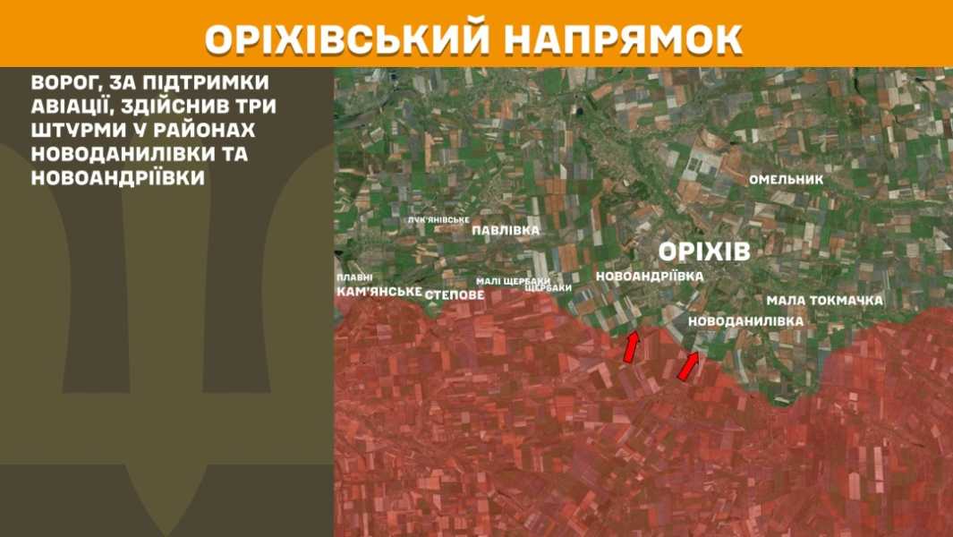 In the Orikhiv sector, the enemy, supported by aviation, carried out three assaults in the areas of Novodanylivka and Novoandriivka.