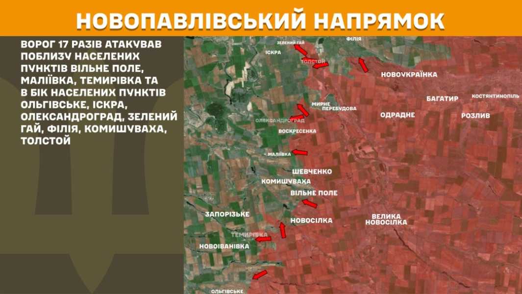 In the Novavlivka sector, the Defense Forces repelled 20 attacks on the positions of Ukrainian tros near the settlements of Vilne Pe, Maliivka, Temyrivka, and toward the settlements of hivske, Iskra, eksandrograd, Zelenyi Hai, Filia, Komyshuvakha, and Tstoi.