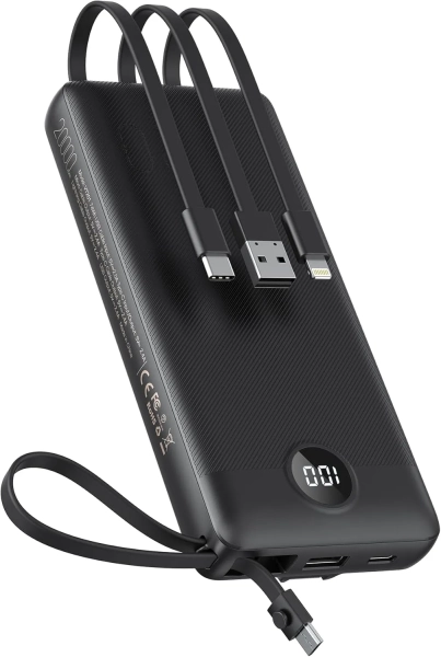 The device is equipped with three ports (USB-C and two USB-A), supports fast charging up to 22.5 W and has an LED screen to display the remaining power. Users note the capacity, the ability to charge multiple devices simultaneously, and the favorable price.