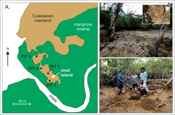 During geoarchaeological surveys, scientists came across a small low-lying ledge with an area of about 3,000 square meters, located near the Kulasawani area. Initially, this place, surrounded by dense mangrove forests, was considered an ordinary natural peninsula. However, a more detailed study showed that the object is an isolated island, which is 70-90 percent composed of shells of edible mollusks mixed with sandy-clay soil. The activity of local crabs, which dig holes, allowed researchers to see the contents of the deep layers without large-scale excavations: the animals brought the remains of shells to the surface from a depth of 30-50 centimeters, writes IFLScience.